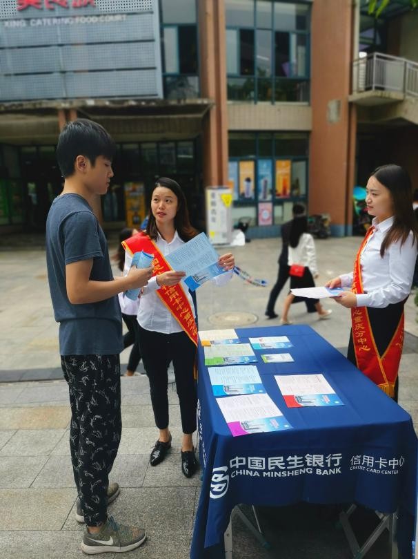 9月25日中午,中国民生银行信用卡中心重庆分中心宣传小组在学校食堂区域设点宣传,通过发放宣传材料及现场讲解等方式,为在校大学生讲解远离校园不良网络借贷、非法金融活动应对方法、维权投诉、银行卡信息安全、征信、防范投资风险、识别非法金融广告等方面的知识,引导大学生科学合理使用金融产品和服务,提升保障自身资金财产安全的意识和能力。