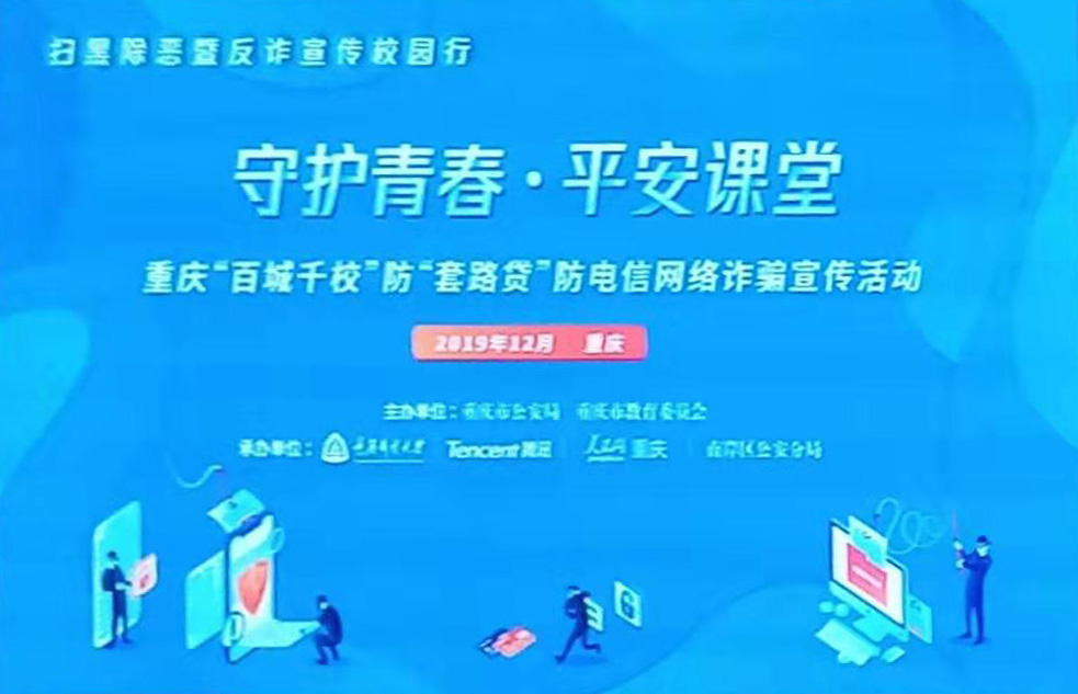 12月9日,由重庆市教委、市公安局联合组织的“百城千校”防“套路贷”、防电信网络诈骗宣传教育活动在重庆邮电大学综合实验楼学术报告厅举行。m88获2019年度平安校园反诈行宣传教育活动示范学校荣誉称号。