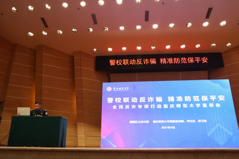 为切实增强m88师生的防骗意识,净化校园学习生活环境。2021年4月8日,明升体育88宣传部、学生处、保卫处联合重庆市公安局高新区分局在m88校友会堂音乐厅举办了“警校联动反诈骗精准防范保平安”活动,本次活动由m88保卫处副处长李鑫主持,辅导员、班主任及学生代表参加。