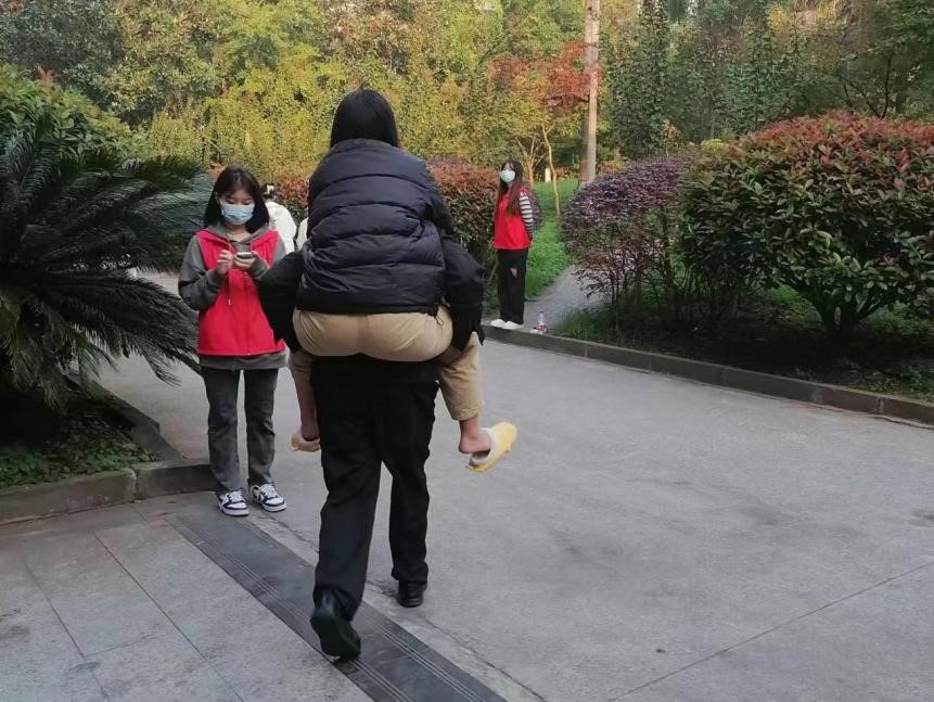 在核酸检测过程中,有学生反映有一名学生腿脚不便,行走困难,安保部负责现场秩序维护的班长傅泽明了解学生情况后,主动前往学生寝室,背起学生到核酸检查点,协助学生完成核酸检查后再次背起该生返回寝室,并提醒学生注意身体,早日恢复健康。被帮助学生对物业安保人员的热心帮助表达了感谢,同时,现场的师生及相关工作人员也给与高度的评价和点赞。