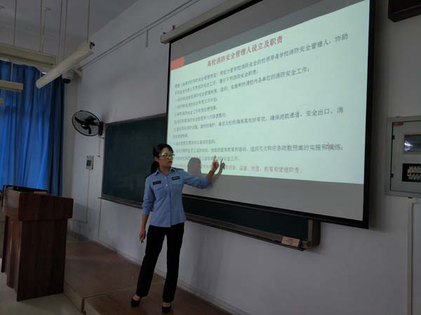 试讲中,欧教官着重对消防安全责任制进行了详细的讲解;蒋教官提到哪有什么岁月静好,不过是有人为你负重前行。他带领同学们回顾了在四川凉山火灾抢险中遇难的消防员们,由此引出防火的重要性;刘教官详细讲解了当火灾发生时,同学们拨打报警电话要保持冷静,讲明着火地点、起火原因、有无人员被困以及人员受伤等情况。此外,每位培训的教官都对灭火器的使用进行了不同层次的讲解。随着最后一位教官的讲解完毕,此次培训试讲圆满完成。