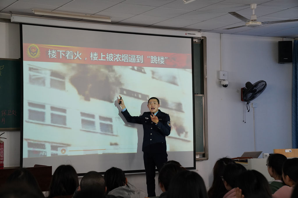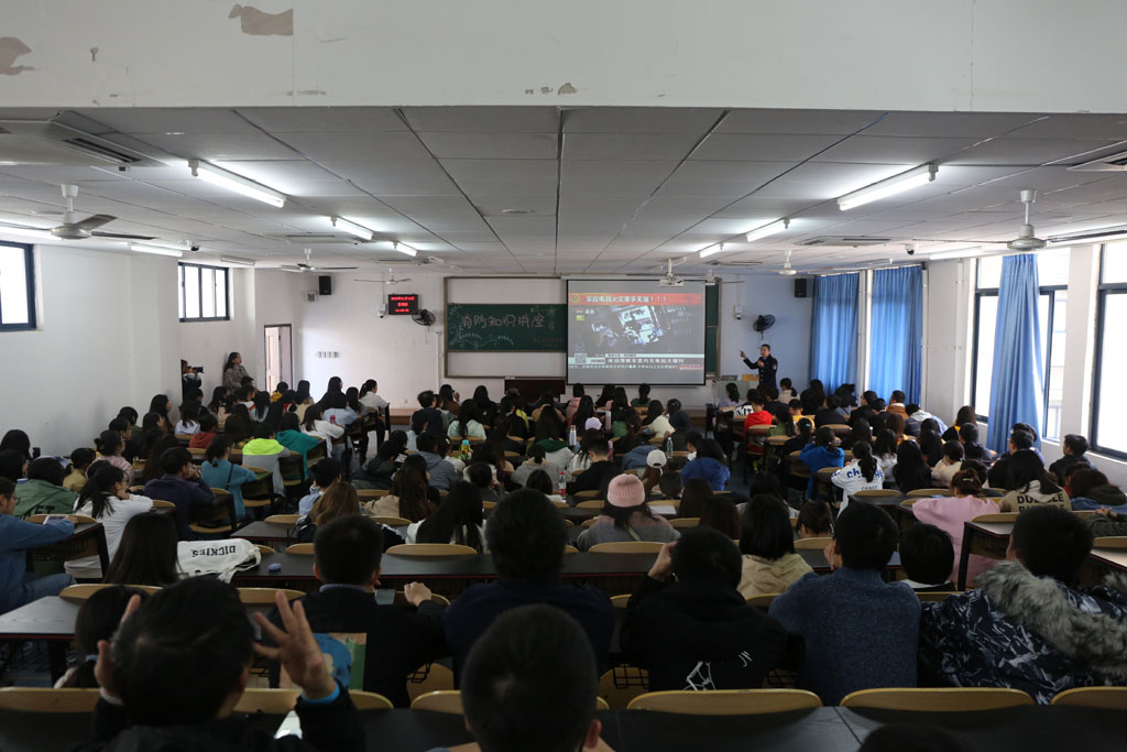 在开展现场灭火演练的同时,消防安全知识讲座在砺志楼2302教室进行,本次讲座由利民防火中心教官主讲,全校共300余名同学参加。培训中教官引用大量实际生活中的真实案例和具体的数字告诉同学们由于缺乏消防安全知识而引发的事故,并通过理论讲解和典型案例剖析相结合的方式,就疏散逃生的基本常识、消防设备如何使用等问题进行了深入浅出的讲解。