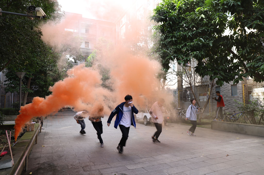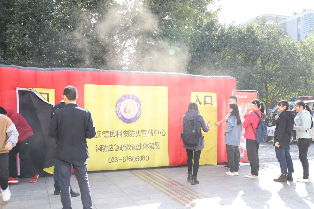 11月14日两点半,现场灭火演练及模拟烟雾逃生屋体验活动在体育馆(1号门)雕塑处正式开始,全校共320余名同学参加。同学们身临其境,实地模拟体验并掌握消防灭火和烟雾逃生的要领。