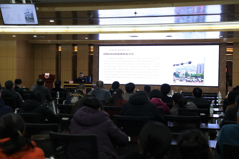 围绕“落实主体责任,共建平安校园”这一主题,韩召波从面对高校火灾频繁问题该如何追责问责、校园生活中常见的消防隐患应及时通报、宣贯消防法责任制办法和高校内部的一些相关规定以及如何做好高校消防安全防控四个方面展开宣讲。