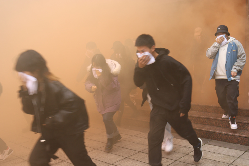 随着警报声拉响,烟雾弹点燃,现场模拟楼内一楼的产品设计工作室因操作不当引燃室内衣物造成火情,演练正式开始。在烟雾弹的作用下,楼道里浓烟滚滚,几乎看不清任何东西。隐隐约约传来同学们的互相提醒:“弯腰!用手帕捂住口鼻!快快快!”各楼层的指挥人员也引导着学生按照指定路线快速撤离。疏散过程中,学生们低头弯腰,用湿抹布捂住口鼻,快步疾行,有序、安全地到达集合地点。