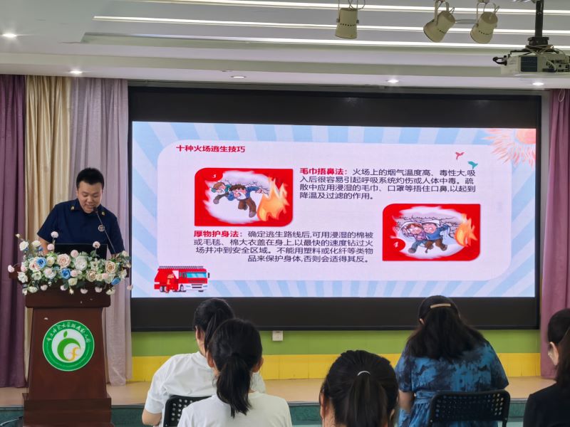活动伊始,消防员化身“安全老师”,结合幼儿园实际情况,通过生动的语言和形象的图片,用简单易懂的方式向老师们讲解火灾的严重危害、高效逃生技巧,以及日常生活中容易忽视的消防隐患。并亲身示范了火灾时如何用湿毛巾捂住口鼻、弯腰低姿逃生等实用技巧,老师们认真学习,不时用手机记录下关键要点。